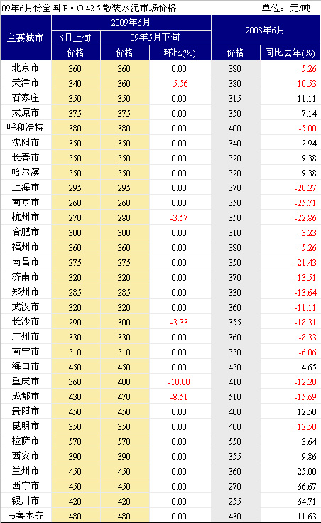 09年6月上旬全國水泥市場價格匯總表